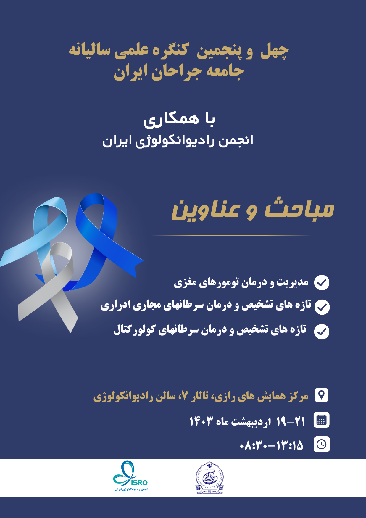 چهل و پنجمین کنگره سالیانه جامعه جراحان ایران با همکاری انجمن رادیوانکولوژی ایران ۱۹ تا ۲۱ اردیبهشت ماه برگزار می شود.