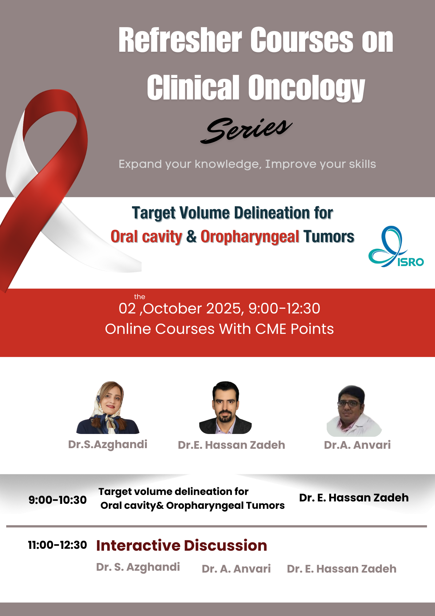 انجمن علمی رادیوانکولوژی ایران قصد دارد در ادامه برنامههای Refresher Courses on Clinical Oncoloy، وبینار علمی در مورد کانتورینگ تومورهای حفرهء دهان و اوروفارنکس را در تاریخ ۱۰مهر ماه ۱۴۰۴ برگزار کند.