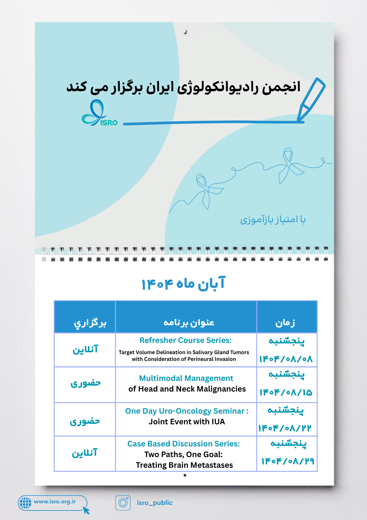 انجمن رادیوانکولوژی ایران با کمال افتخار اعلام میکند که در آبان ماه ۱۴۰۴ برنامهای علمی و آموزشی با محوریت موضوعات روز و چالشهای موجود در حوزه رادیوانکولوژی برگزار خواهد کرد.
