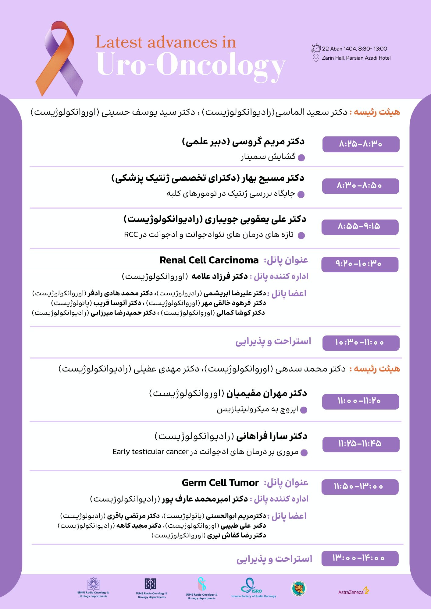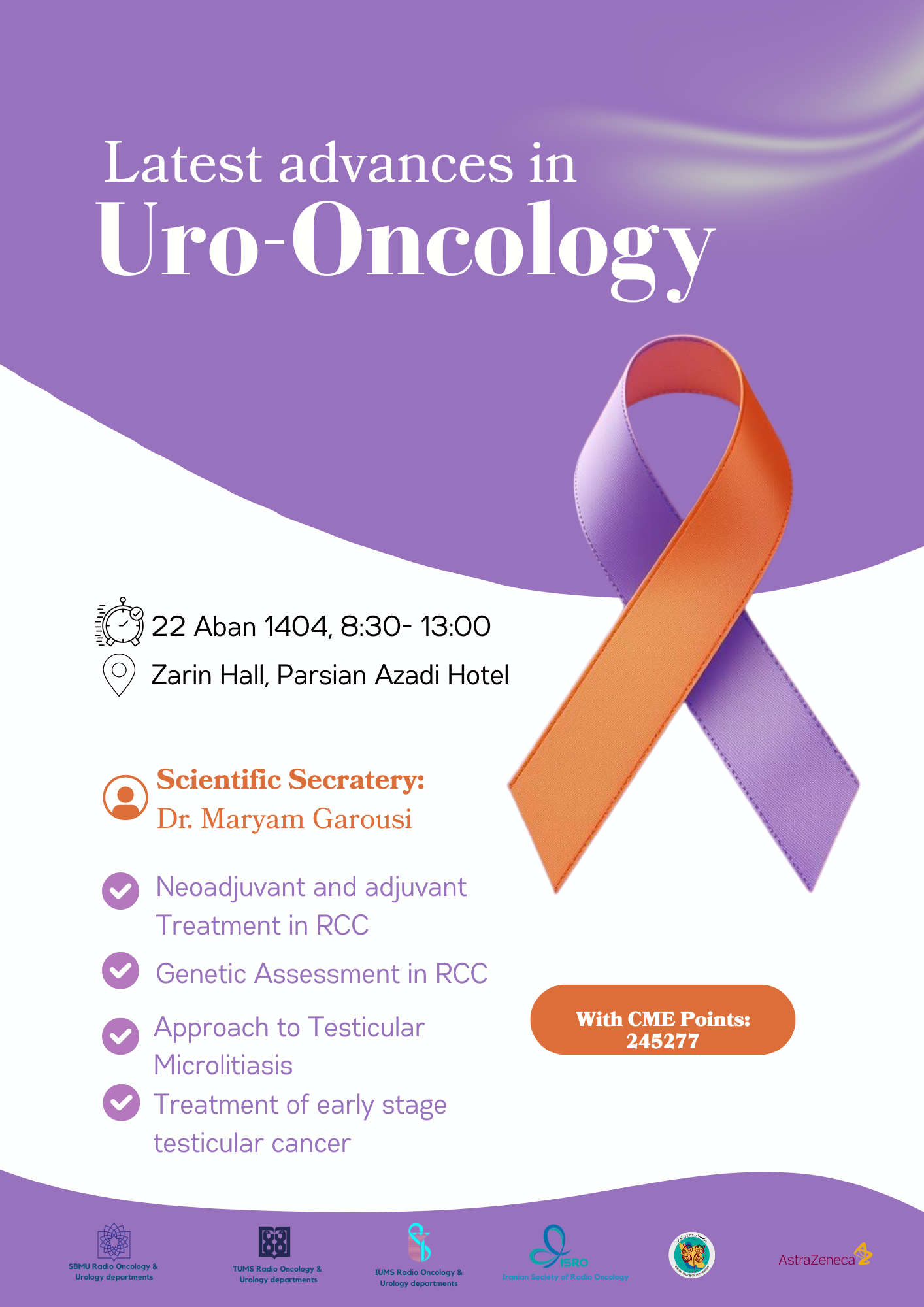 انجمن علمی رادیوانکولوژی ایران و جامعه اروانکولوژی ایران ، سمینار تخصصی اوروانکولوژی را در تاریخ 22 آبان ماه از ساعت 8:25 تا 13 در سالن زرین هتل پارسیان آزادی برگزار میکنند.